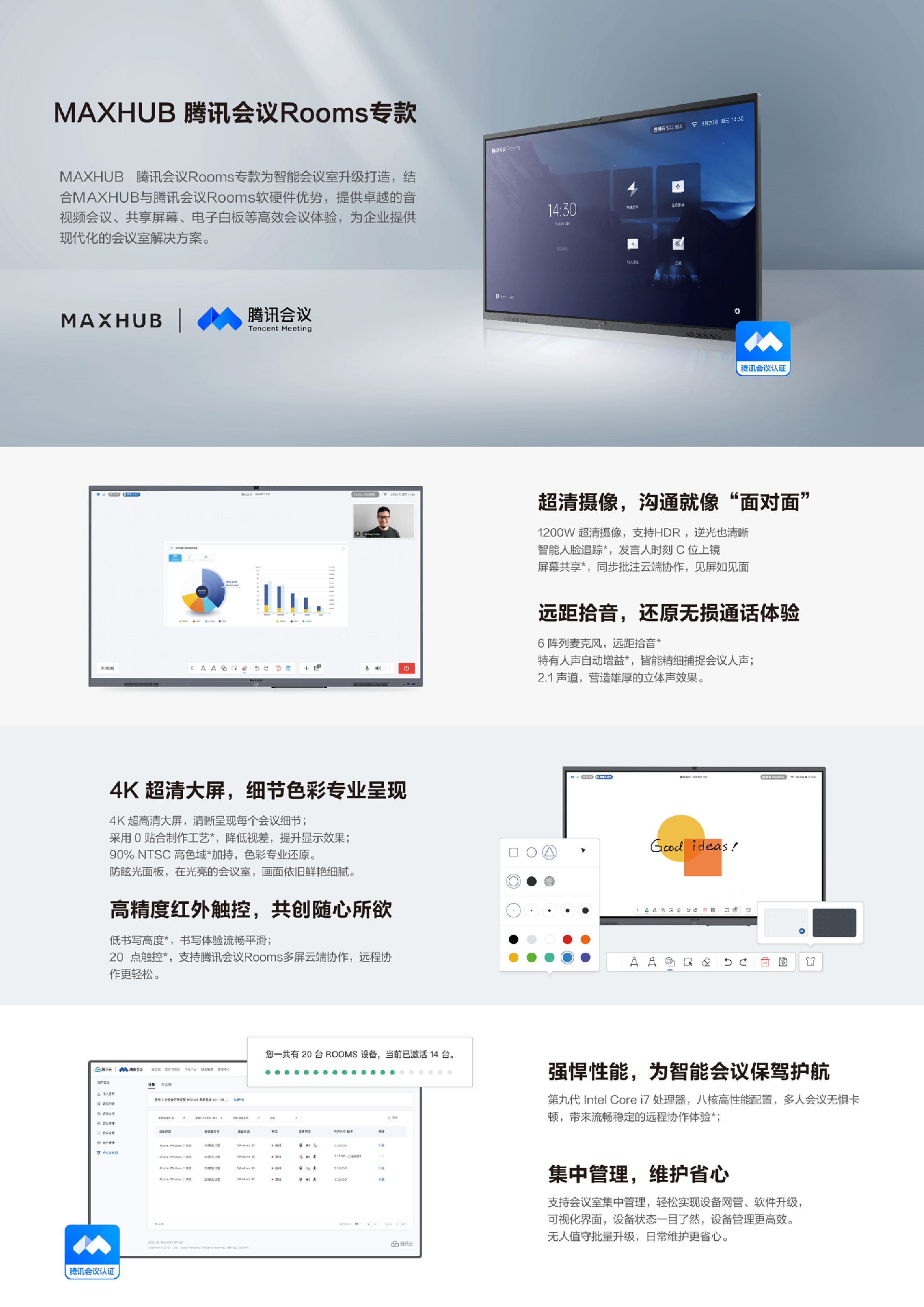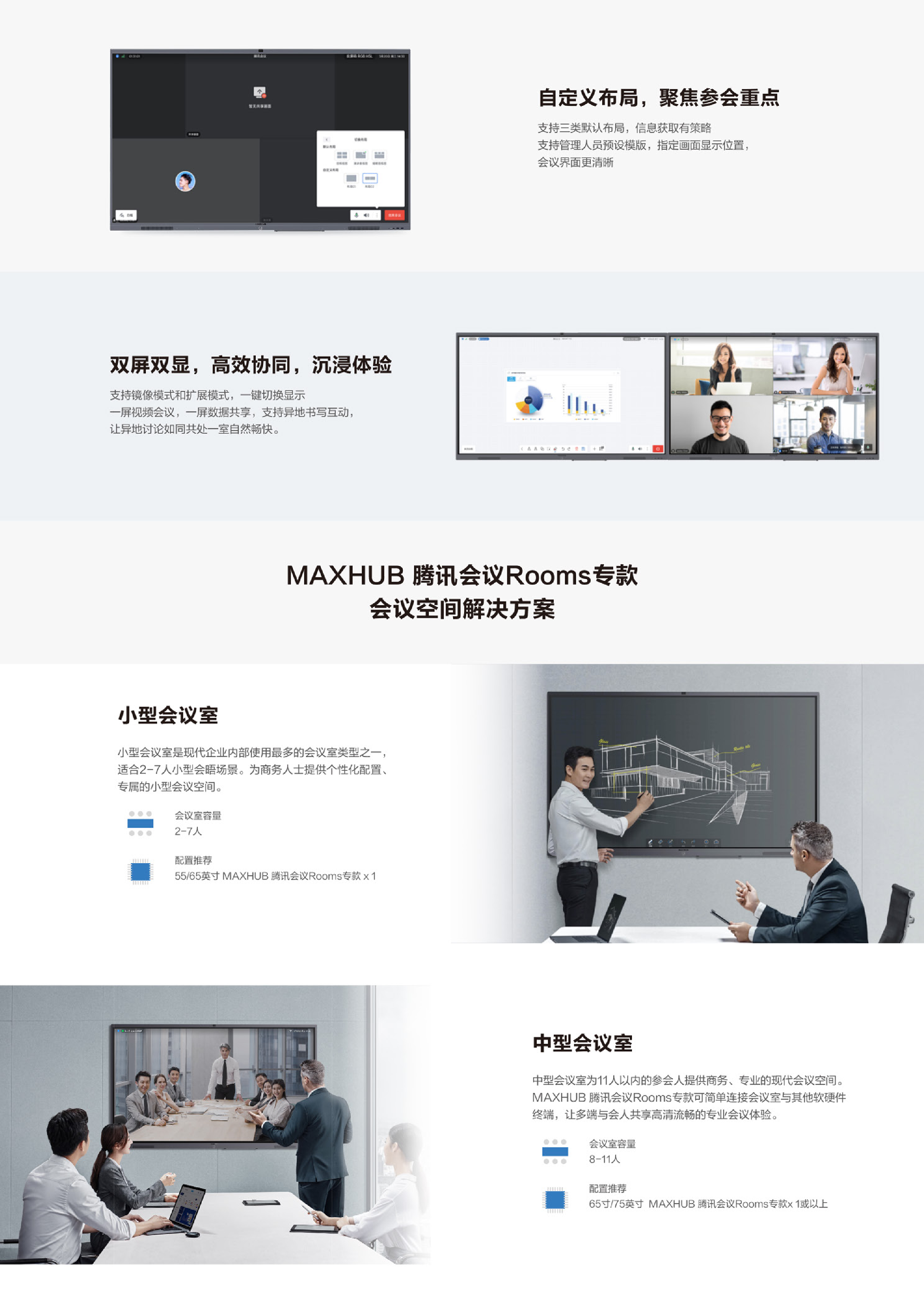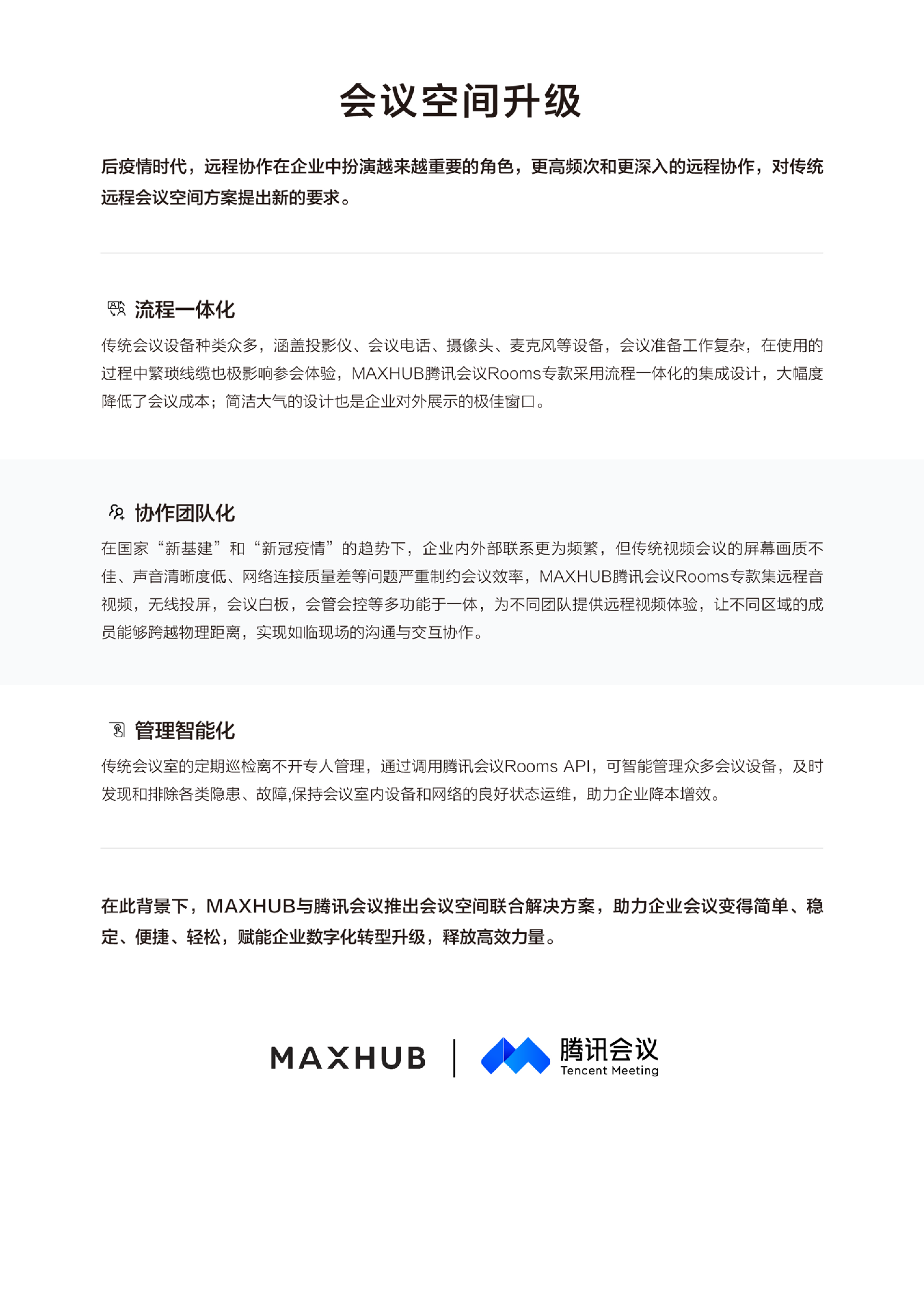 会议空间联合解决方案全文展示了会议空间升级的发展趋势、MAXHUB腾讯会议Rooms专款方案介绍、会议空间解决方案和联合方案介绍。