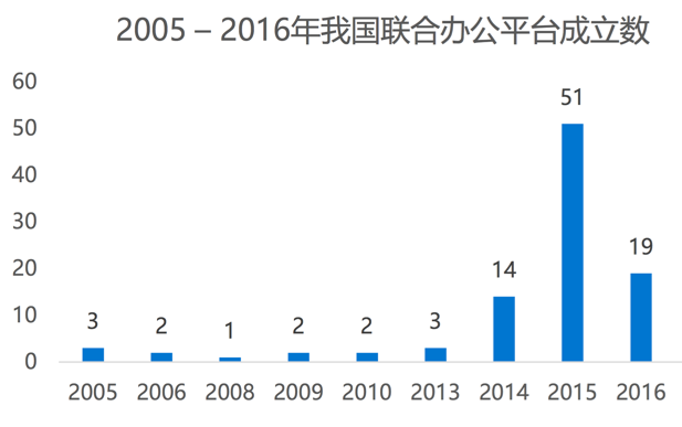 据今年发布的《联合办公空间研究报告》显示,曾因“双创”等政策支持,发展得如火如荼的联合办公行业,近年机构数量已渐趋稳定。36氪研究院分析师认为,“2015年井喷式发展之后,实力弱的企业已被淘汰,现在业内已对新进入者形成了壁垒。”
