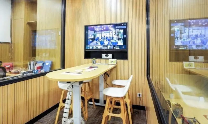 以最近刚获得近2亿融资的办伴科技为例。这个率先提出“超能办公室”的共享办公空间,通过引进MAXHUB会议平台,竟在一个不到5㎡的空间,实现了会议讨论、商务洽谈、远程视频协作、在线培训等全方位功能。