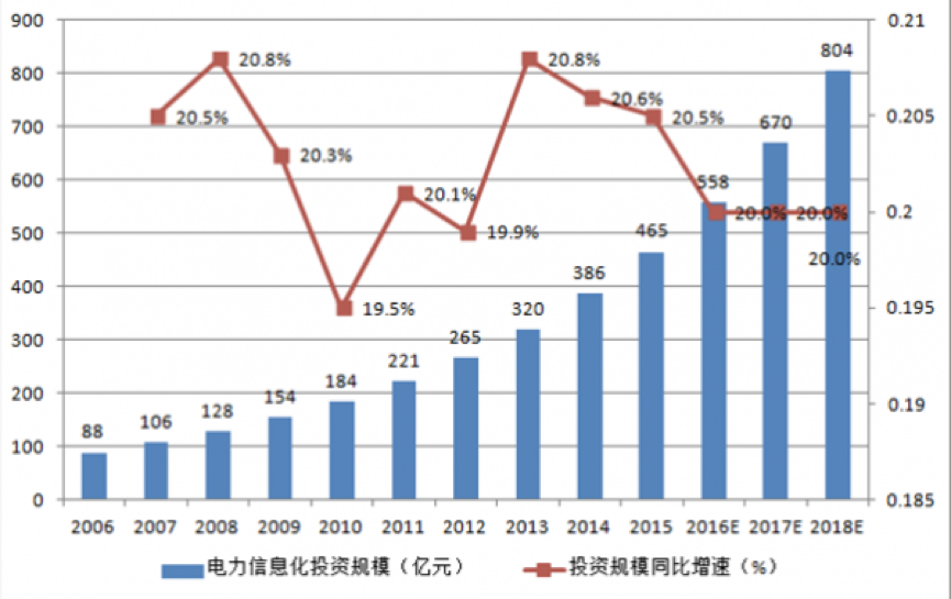 由中国电力企业联合会发布的一组数据显示,目前我国电力信息数字化投资规模速度增长约20%,预计2018年规模将高达804亿元。